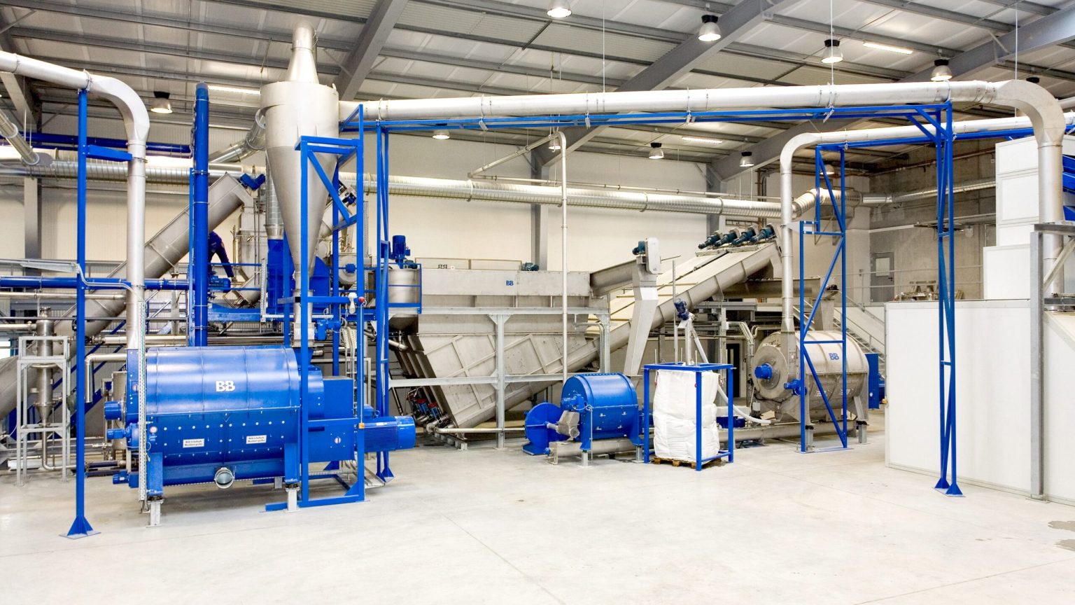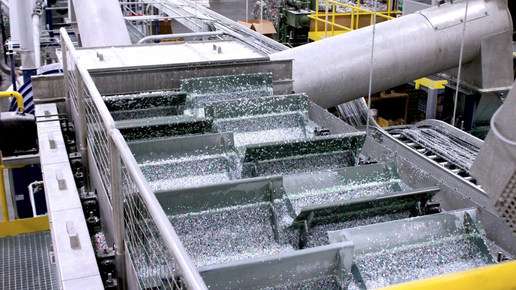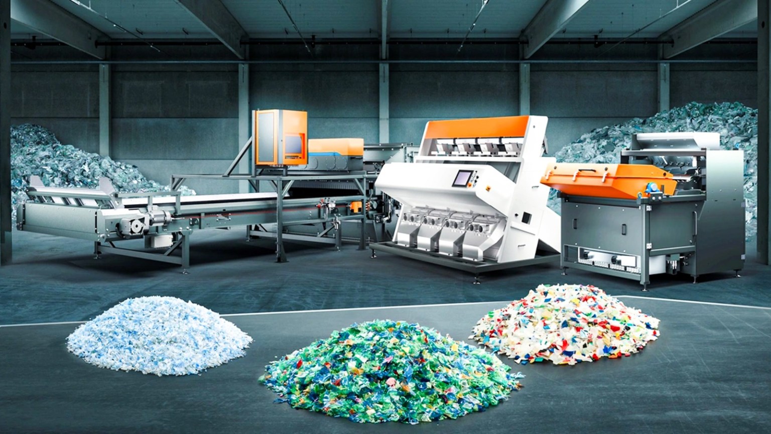 Post-consumer PET bottles are sorted into transparent/uncolored, blue and green, and mixed-color fractions to ensure material consistency.